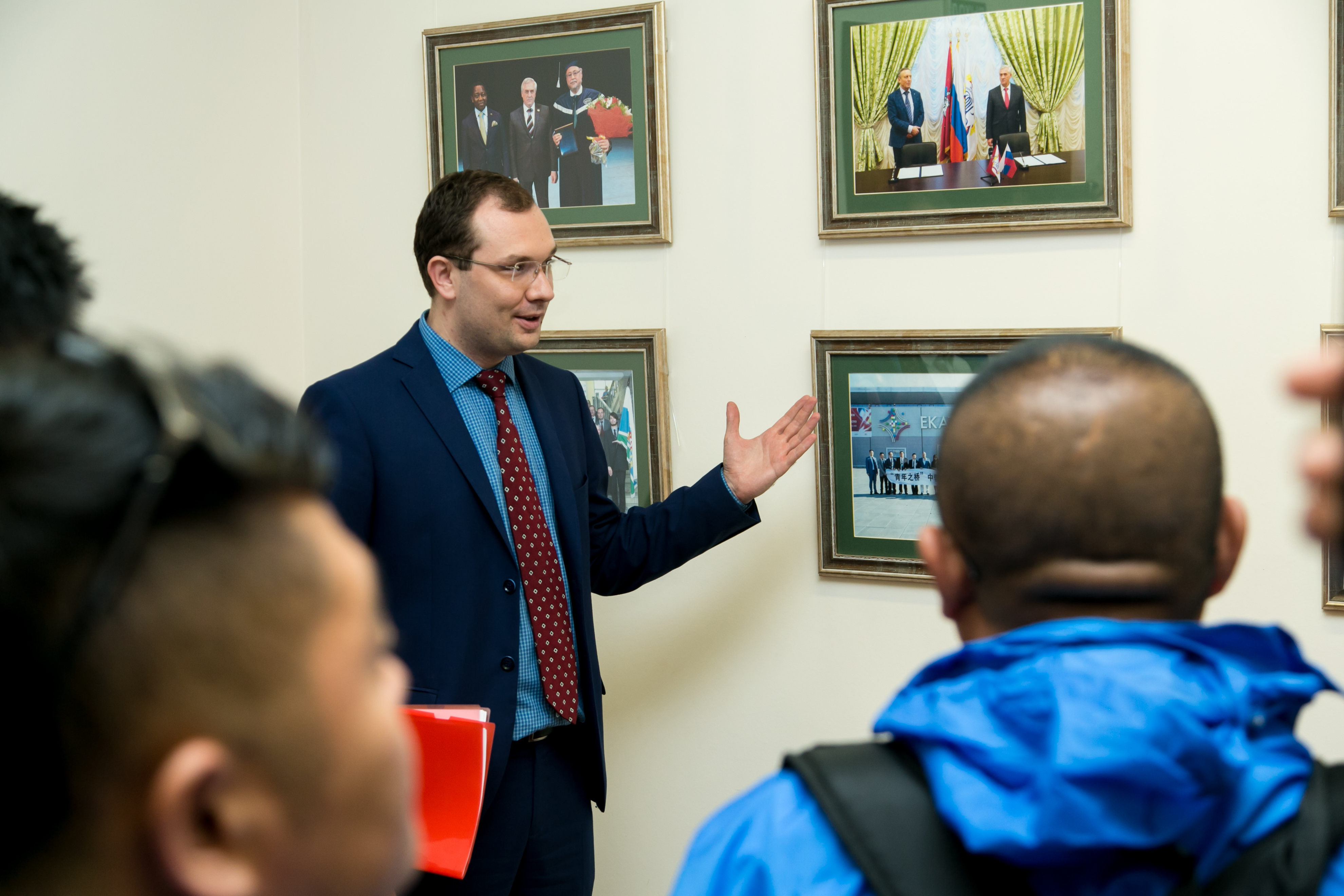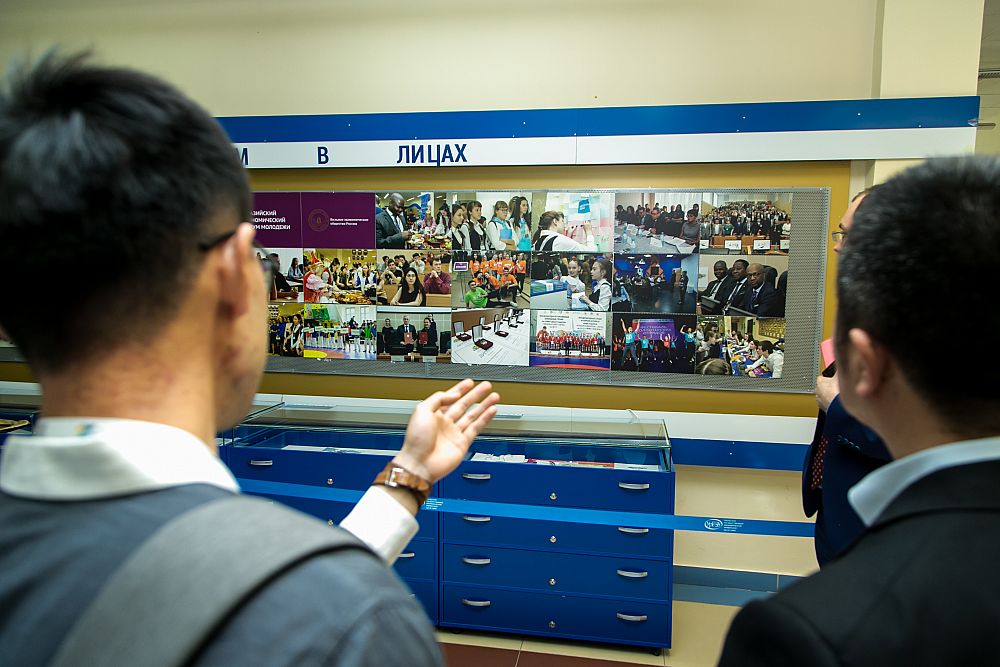 The guests were met by the USUE Vice-Rector for Social Work Roman Krasnov. He showed them the exhibition of the Eurasian Economic Youth Forum. "EEYF is a hallmark of our University. This year the forum gathered a record number of participants - 2500. It was attended by representatives from 64 countries and 69 constituent territories of the Russian Federation. Next year there will be the jubilee tenth forum and we invite you to participate in it," Roman Valerievich noted.