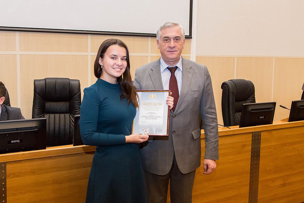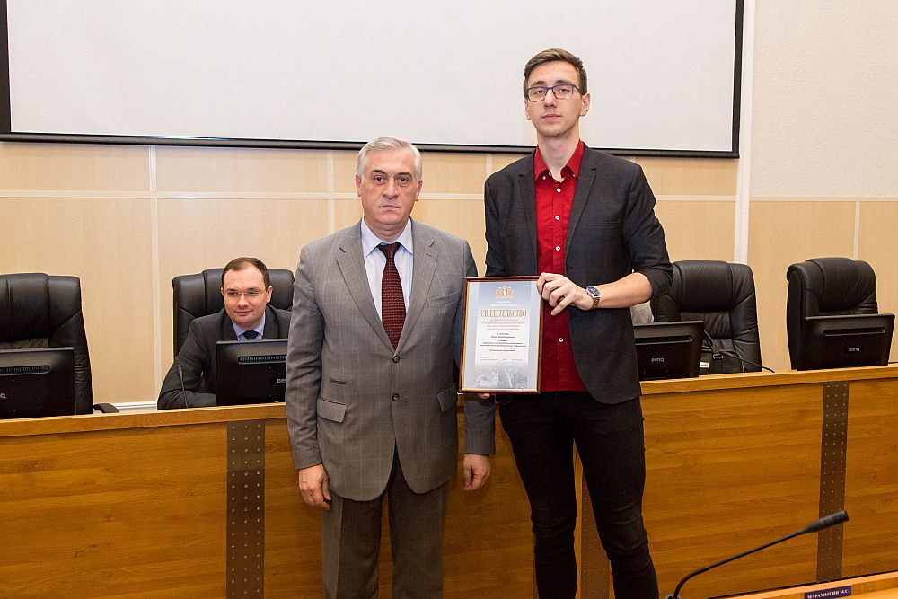The certificate of the Sverdlovsk region Governor’s scholarships granted for outstanding achievements in educational and creative activities together with the lapel badge were awarded to: