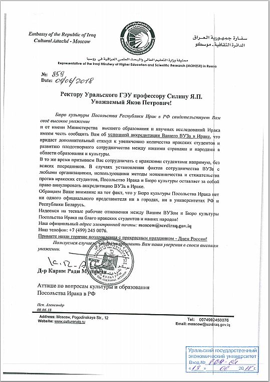 The Ministry of Higher Education and Scientific Research of the Republic of Iraq informed about the accreditation of USUE in the Republic of Iraq. The recognition of USUE diplomas in Iraq will help increase the number of Iraqi students studying at the economic university.