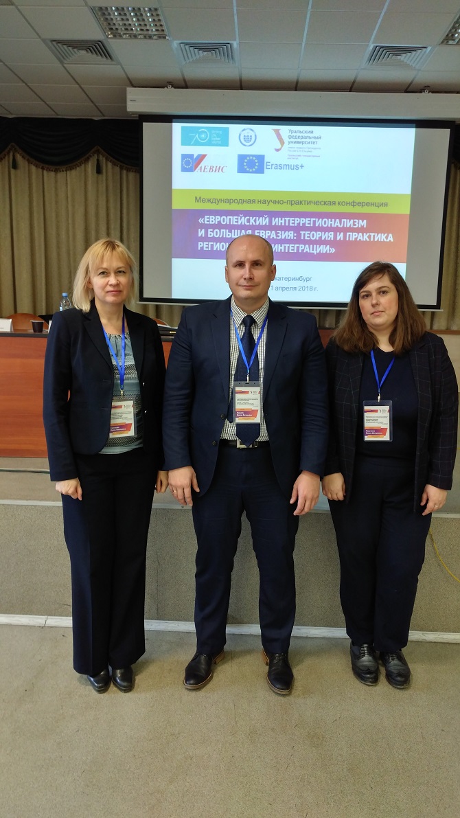 The chair of the USUE Department of International Business Victor Kovalev and associate professors of the same Department Oksana Falchenko and Irina Savelieva took an active part and delivered reports at the major International Conference "European Interregionalism and Greater Eurasia: Theory and Practice of Regional Integration", organized on April 20-21, 2018, by the Department of Theory and History of International Relations at Ural Federal University named after the first President of Russia B. Yeltsin.