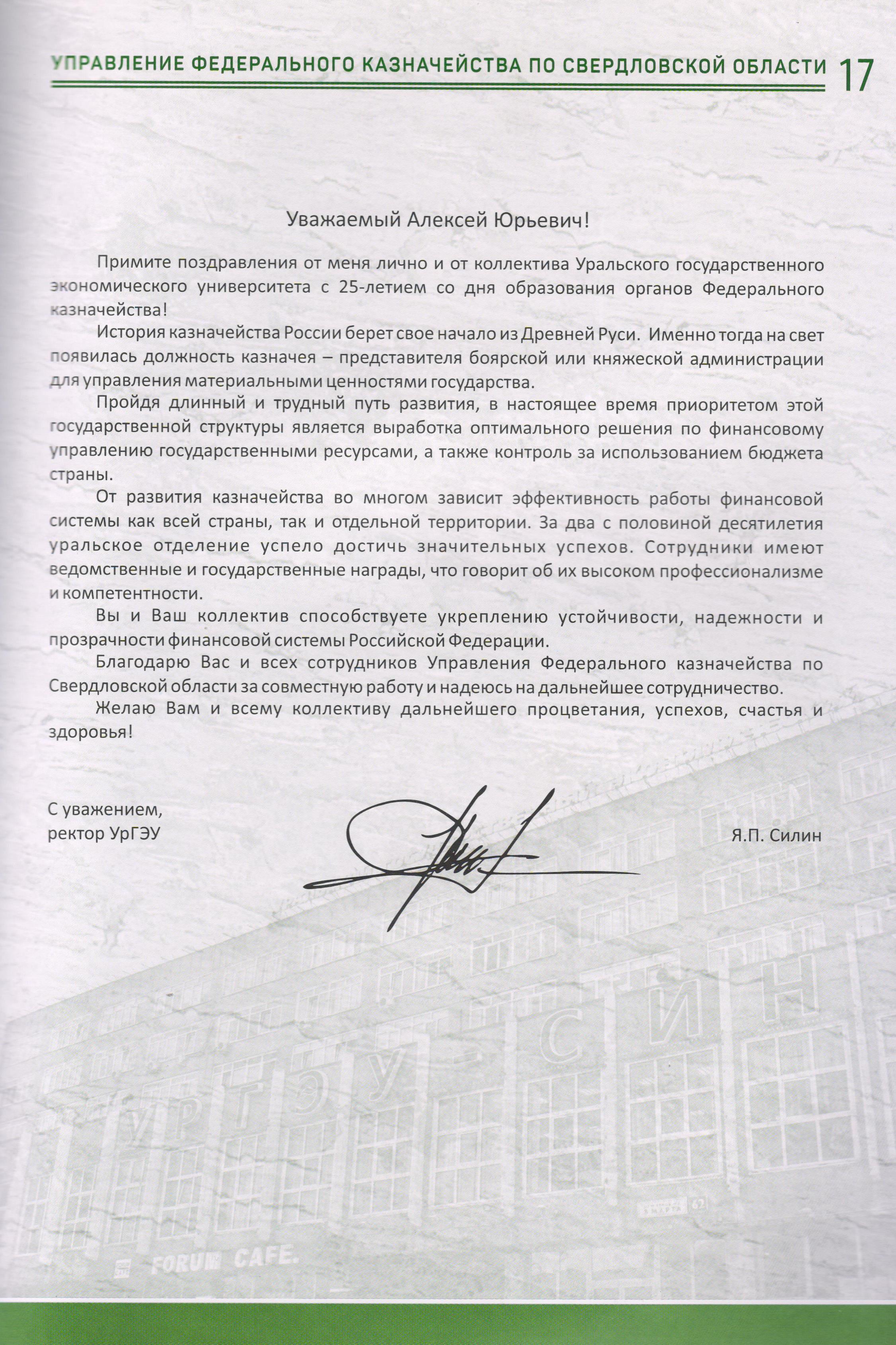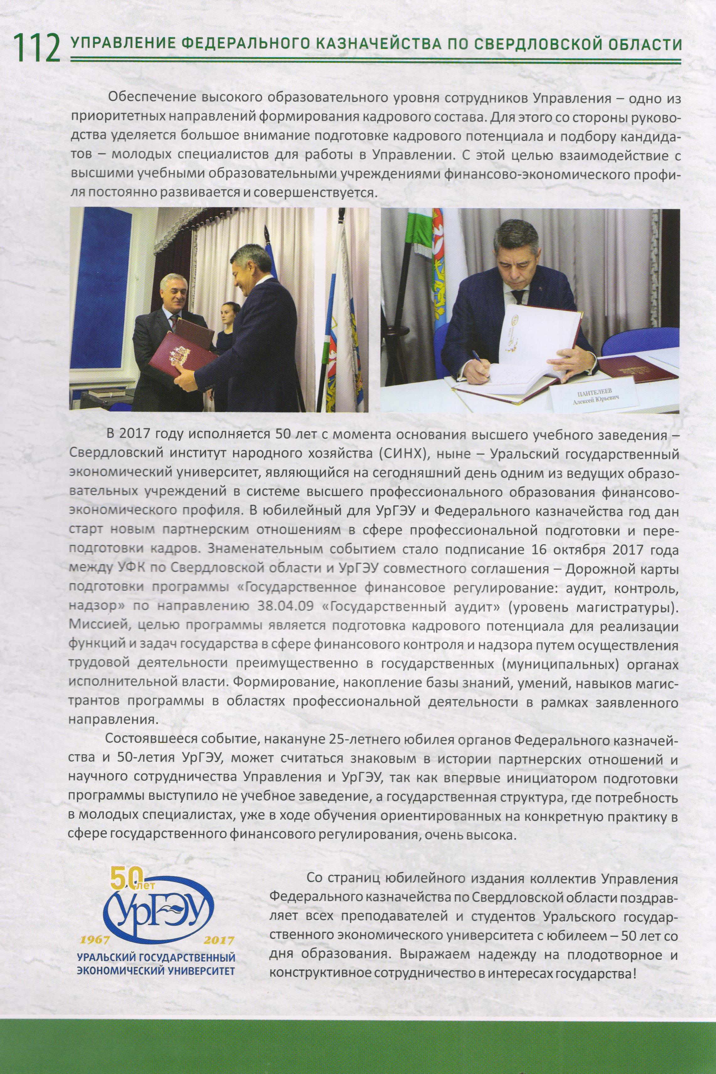 On October 16, 2017, the parties signed a roadmap for the preparation of the master's program "State Financial Regulation: Audit, Control, and Supervision" in specialty 38.04.09 - State Audit. The agreement was signed by USUE Rector of Yakov Silin and the head of the Federal Treasury Department for the Sverdlovsk region Alexei Panteleev. The roadmap is the development of the cooperation agreement signed in 2013.