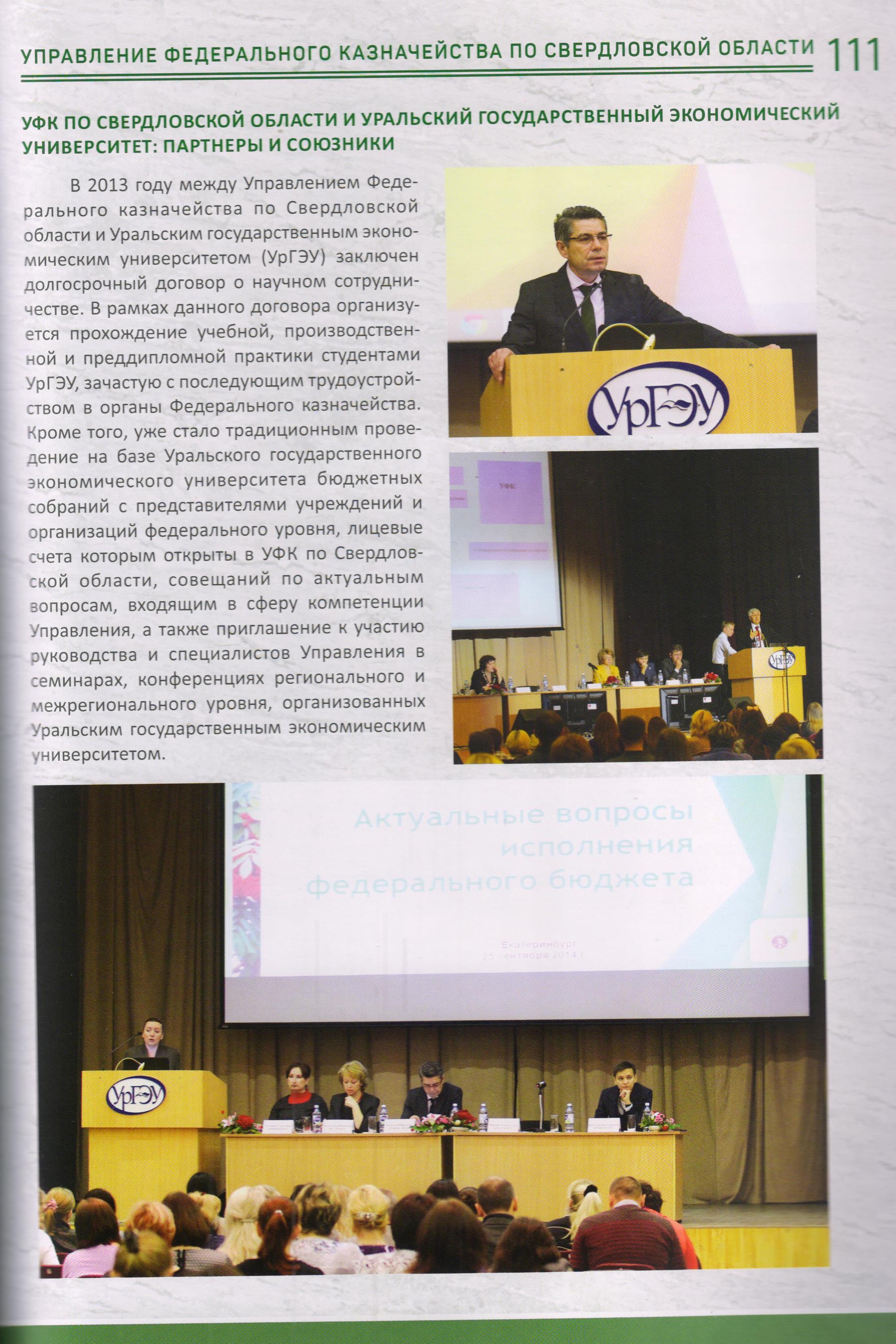 The Federal Treasury Department for the Sverdlovsk region and Ural State University of Economics have been cooperating since 2013. The parties organize on-job and pre-graduation practical training, often with subsequent employment in the bodies of the Federal Treasury.