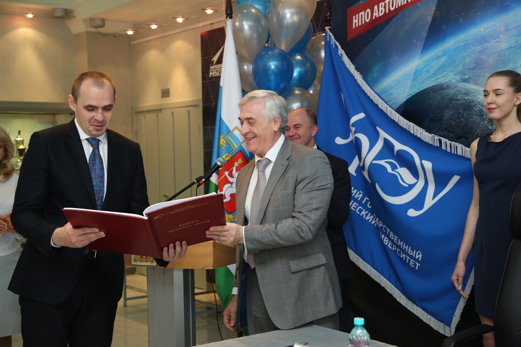 After signing the agreement, USUE Rector Yakov Silin left a note in the book of honorable guests. The participants and guests were invited to visit the Museum of Astronautics and Rocket and Space Technology of the enterprise, where unique high-tech control systems for space and marine guided missiles are presented.
