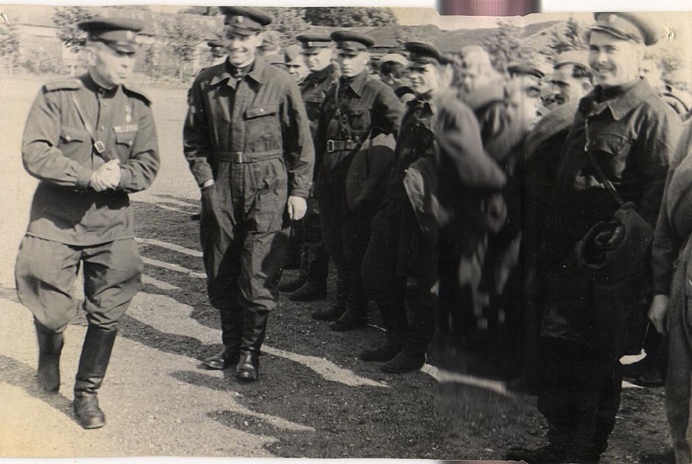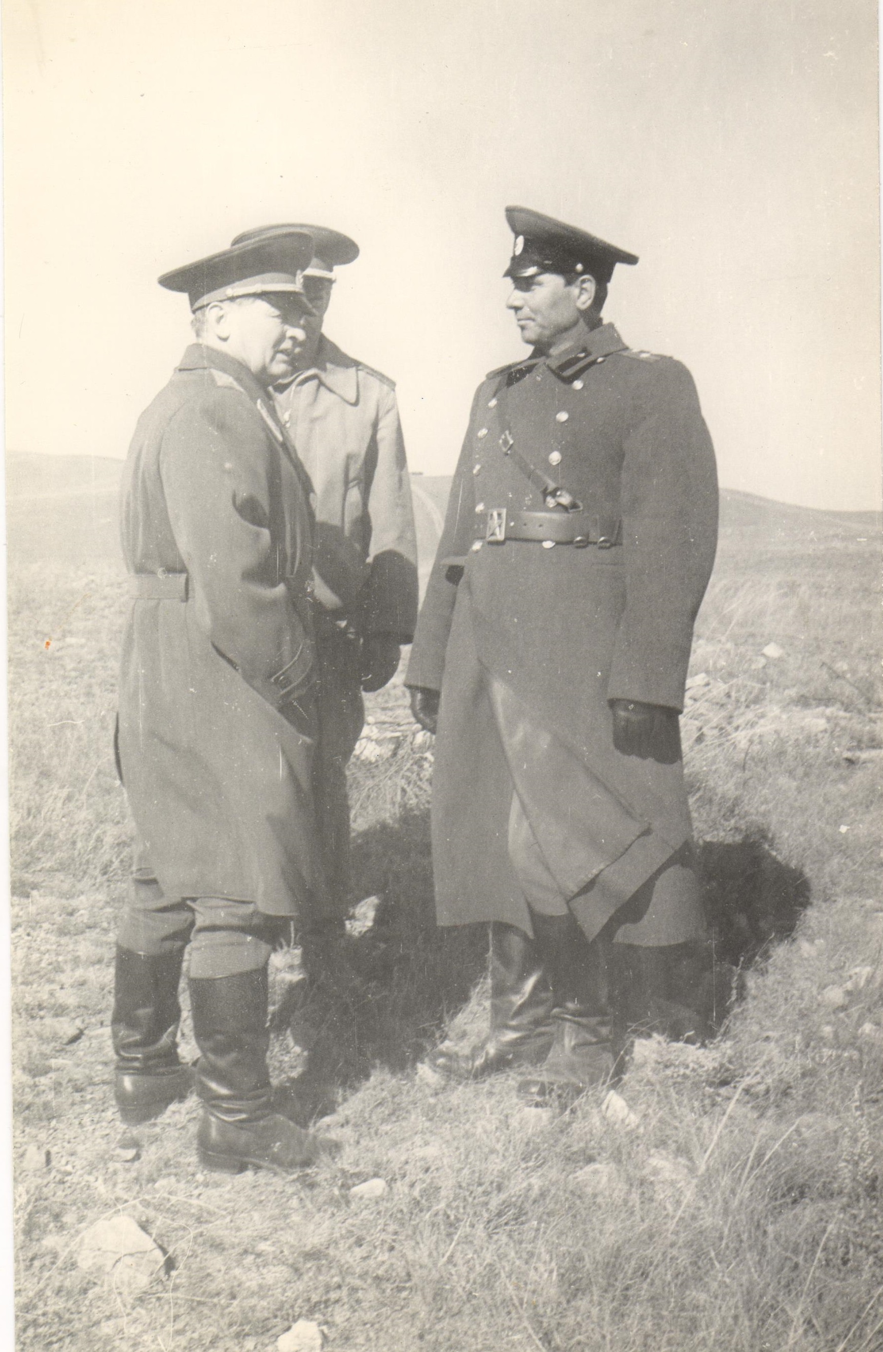 Instruction of tank crews before underwater driving of tanks. From left to right: Battalion commander, Hero of the Soviet Union Ivan Patrushev and political commissar Mikhail Pyatkov.