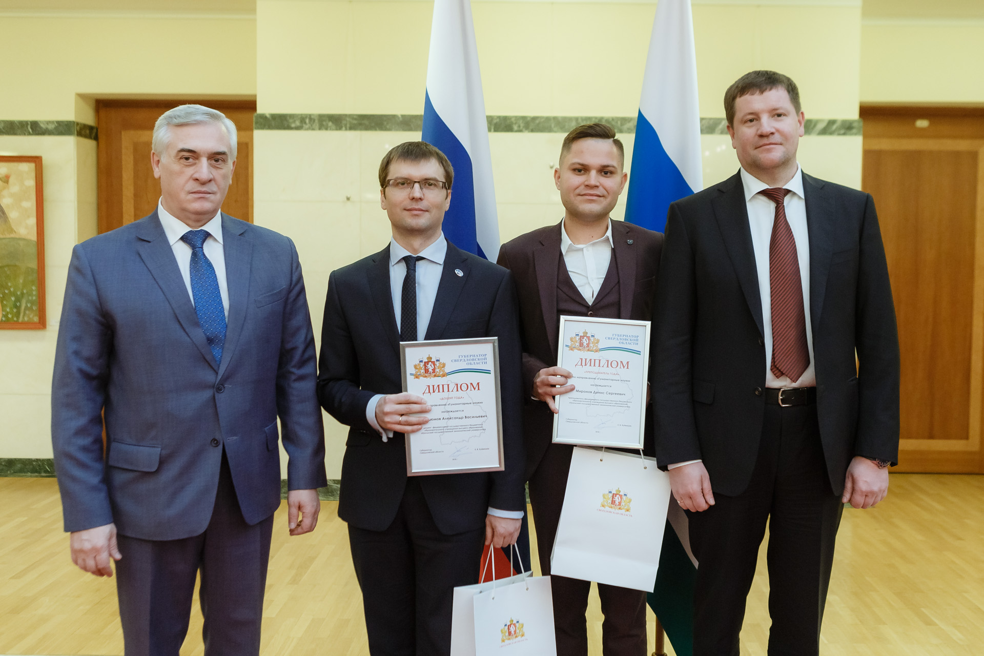 In accordance with the decree of the Governor of the Sverdlovsk region, prizes were awarded to Alexander Kurdyumov in the category "Associate Professor of the Year" and Denis Mironov in the category "Lecturer of the Year." This year the contest was held for the eighth time. The first one was held in 2012. In total, 59 applicants from 15 universities in the region were presented for the prizes of the Governor of the Sverdlovsk region.