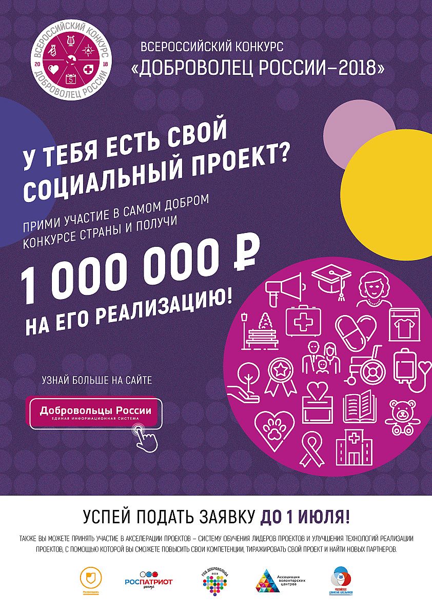 To participate in the contest it is necessary to register in the system and upload your project to the unified information system "Volunteers of Russia" at https://добровольцыроссии.рф By today, more than 2500 applications for participation have been submitted.
