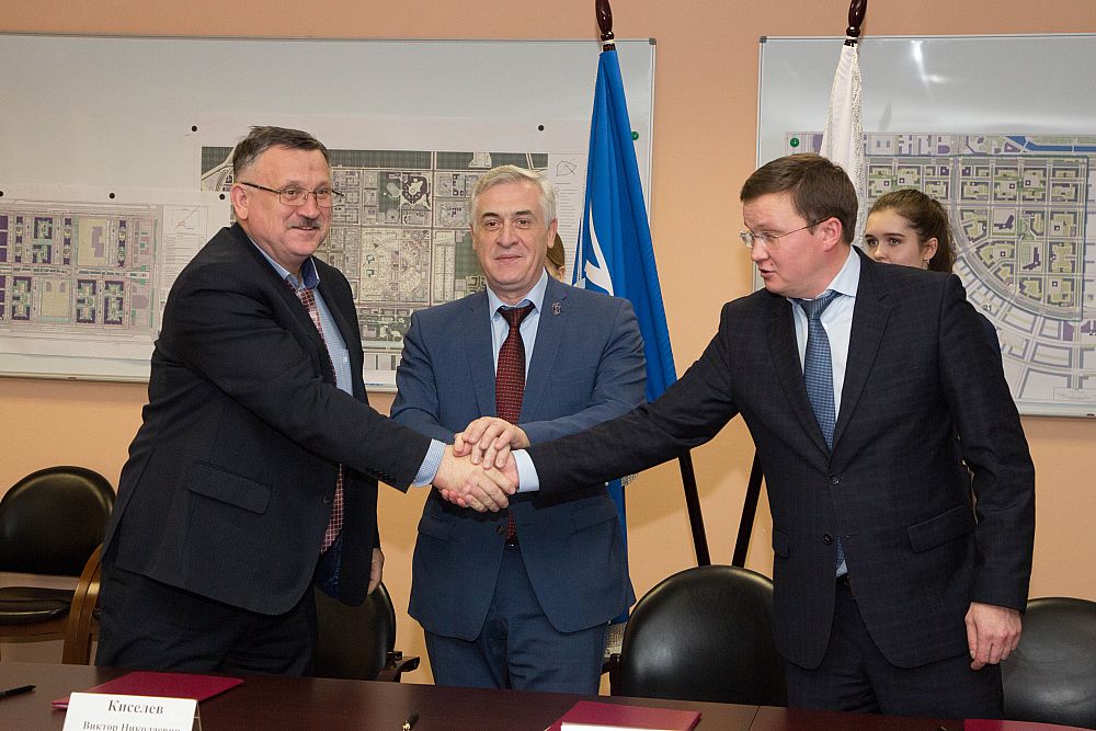 In a solemn atmosphere, USUE Rector Yakov Silin, general director of AO "RSG-Academicheskoye" Viktor Kiselev, and general director of ZAO "UK-Academichesky" Nikolai Smirnyagin signed a trilateral agreement on cooperation.