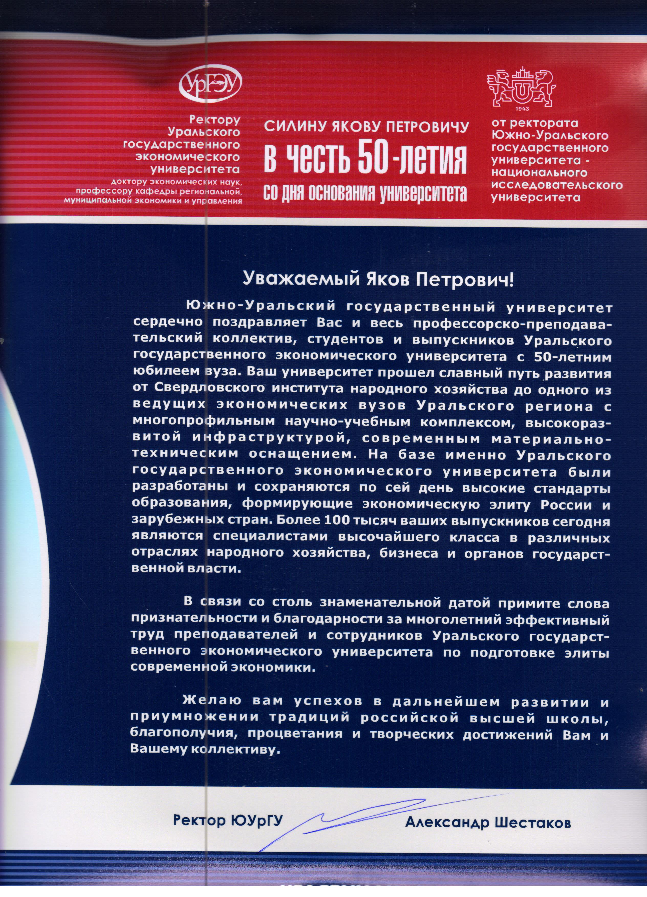 "Your university has passed a long way from the Sverdlovsk Institute of National Economy to one of the leading economic universities in the Ural region with a multidisciplinary research and training complex, highly developed infrastructure, and modern facilities and technical equipment. I wish you every success in further development and enhancement of the Russian higher education traditions, welfare, prosperity, and creative achievements," the congratulation said.