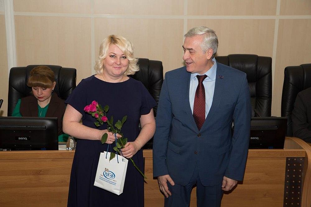 At the meeting, the USUE Chief Accountant Nadezhda Brylyakova was awarded the Certificate of Honor of the head of the Leninsky District Administration Dmitry Nozhenko for her many years of dedicated work, professionalism, and significant contribution to the training of highly qualified personnel.