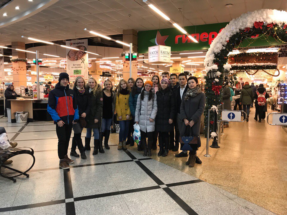 Recently, students of TiE-16 group of Ural State Economic University under the guidance of Svetlana Tsaregorodtseva, associate professor of the Department of Commerce, Logistics and Trade Economics, took a tour to the supermarket Hyperbola, which is located in the shopping center "Greenwich". The tour was conducted by the HR Director Natalia Sangalova.