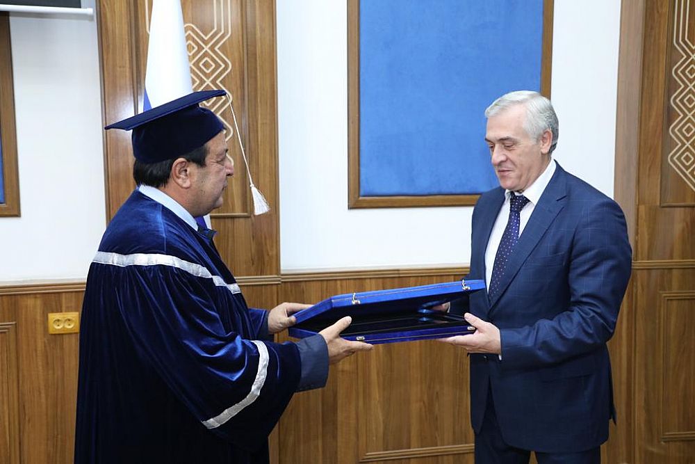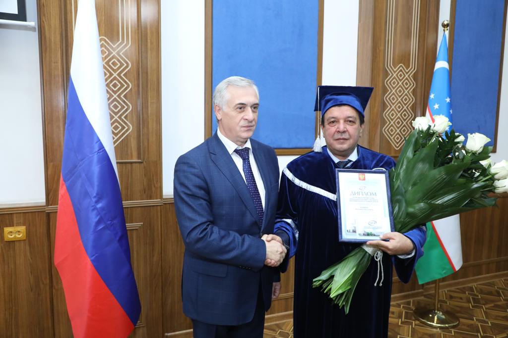 We would like to remind that by the decision of the USUE Academic Council, the rector of the Tashkent State University of Economics, Doctor of Economics, Professor Bakhodir Yunusovich Khodiev was awarded the title “Honorary Professor of USUE”. Today Yakov Silin in a solemn ceremony presented him an academic gown and certificate.