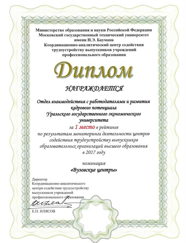 The results of monitoring the activity of the centers for the graduates’ employment promotion in 2016-2017 academic year have been summed up. The USUE Office for Interaction with Employers within the Human Resources Department took the first place in the rating of the university centers.