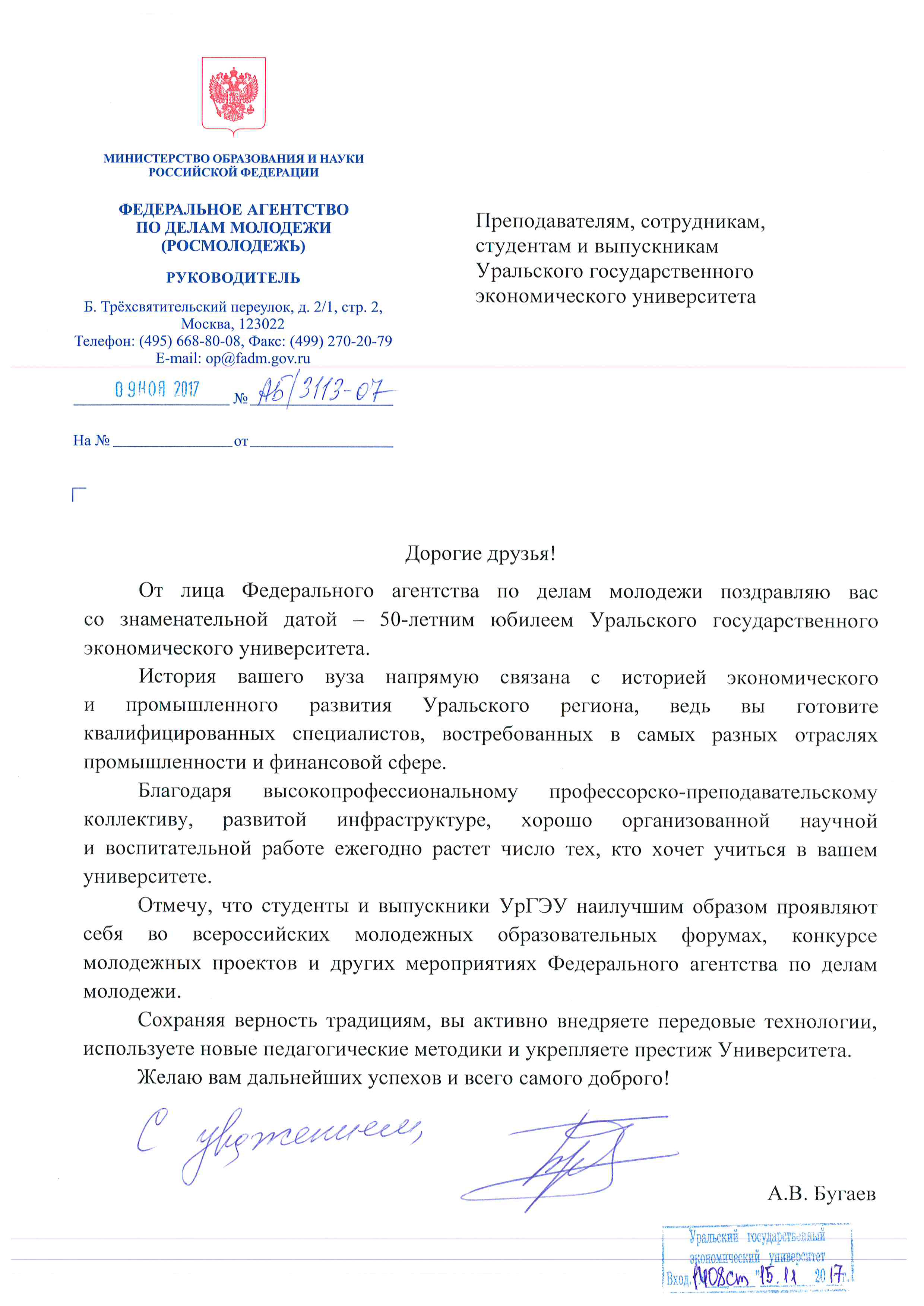 Федеральное агентство по делам молодежи (Росмолодежь) поздравляет Уральский государственный экономический университет с 50-летием.