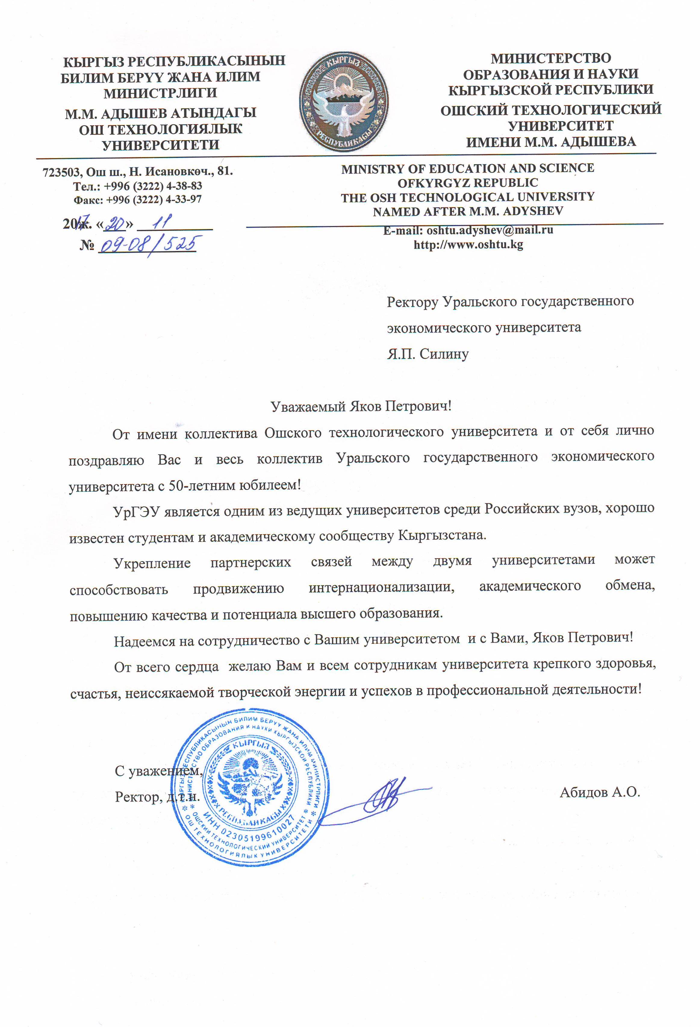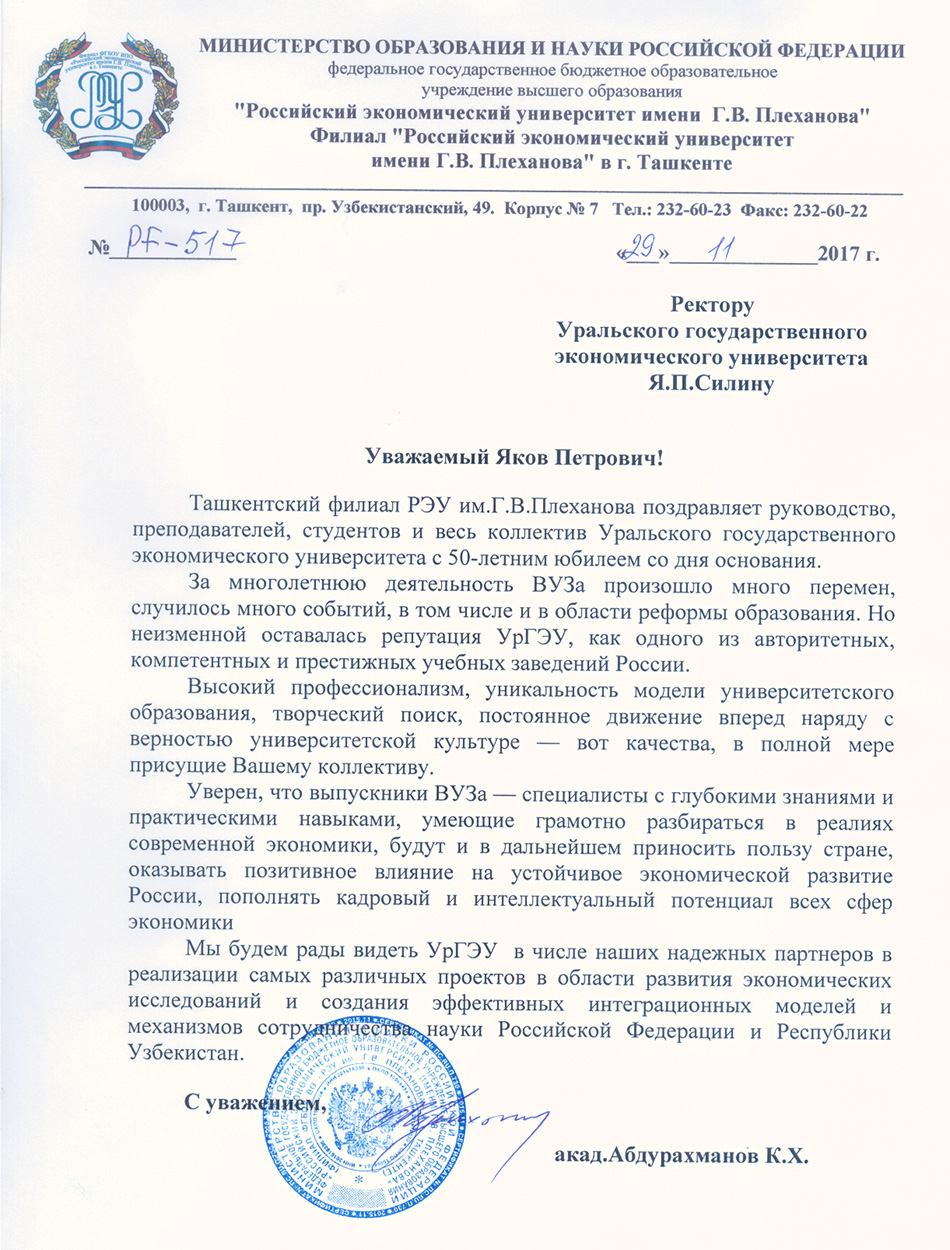 USUE was congratulated by rectors of the Osh Technological University named after M.M. Adyshev, the Uzbek State University of World Languages and G.V. Plekhanov Russian University of Economics.