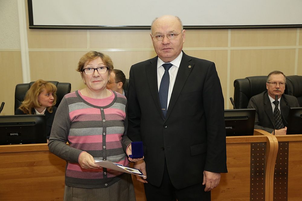 Besides, the Rector awarded Olga Bragina, head of HR department, Vera Rozhanskaya, head of the acquisition sector at the information and library complex, and Tatyana Cherkashina, head of the reference and bibliographic department at the information and library complex. They were awarded the honorary badge of USUE. The award was established for the 50th anniversary of the University. As for today, it has been awarded to 40 faculty and staff members, whose experience at USUE was more than 35 years. All of them have made a significant contribution to the development of the University, participating in various activities aimed at strengthening the credibility of the University.