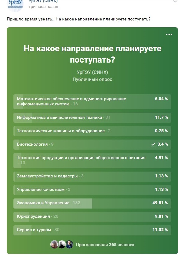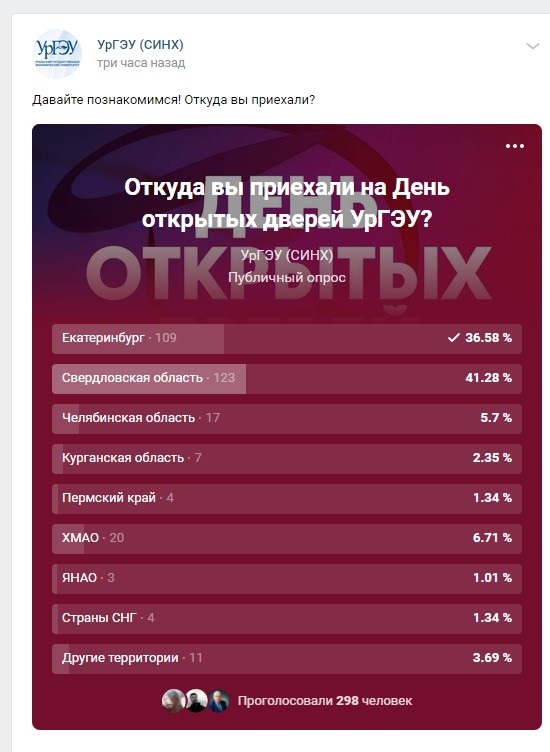 According to the results of the selection of areas for study by applicants, the leader was Economics and Management (49.8%), computer science and computer engineering (11.7%), service and tourism (11.3%), law (9.8%), mathematical support and administration of information systems (6%), product technology and catering (4.9%), biotechnology (3.4%). A survey of the city from which the participants of the open day came showed that the majority of those gathered were residents of the Sverdlovsk Region (41%), residents of Yekaterinburg - 36%, Khanty-Mansi Autonomous Okrug - 6.7%, Chelyabinsk - 5.7%, Kurgan - 2, 3% The remaining 8.3% of those gathered gathered from other territories, including the CIS countries.